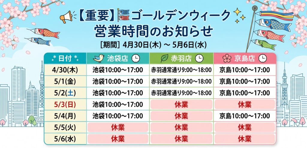 📢 ゴールデンウィーク期間中の営業時間変更のお知らせ